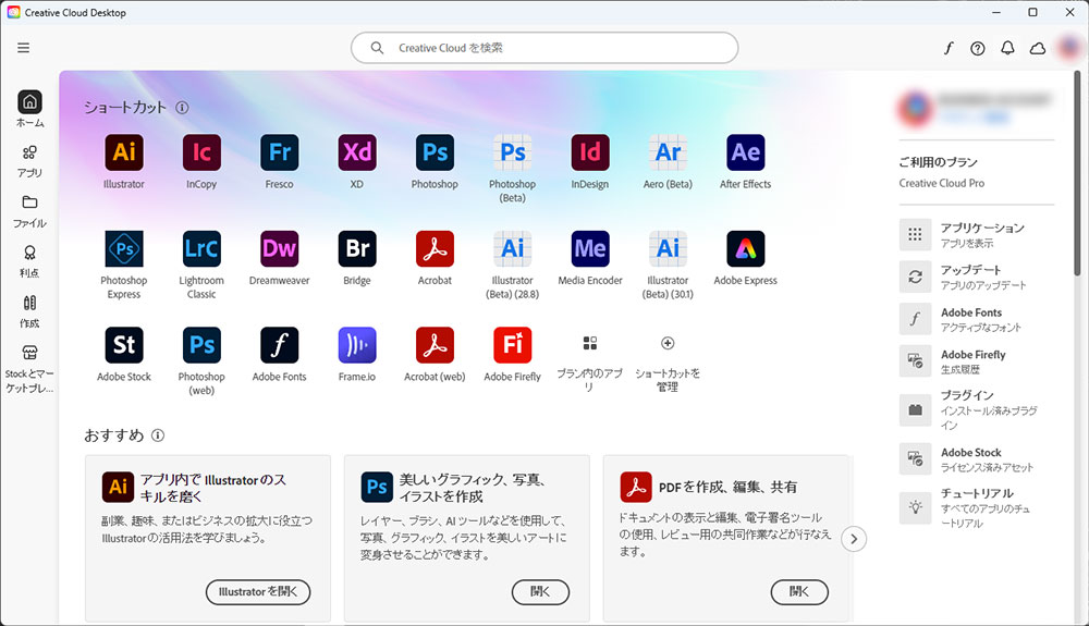 Creative Cloud Desktopの左メニュー内の [ アプリ ] をクリックすると全てのアプリが表示されます。