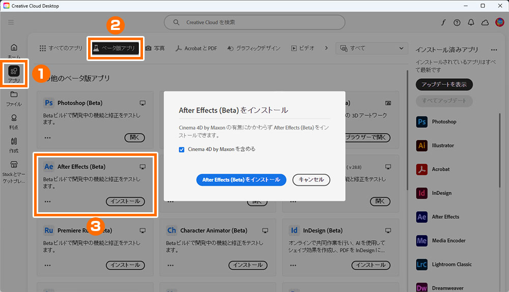 [ After Effects(Beta) ] をクリックしてインストールしましょう。