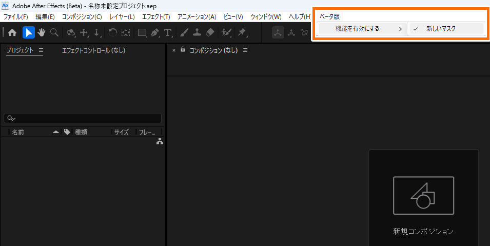 ベータ版のアフターエフェクトでは正式版に未搭載の新機能が使えます。画面上部のメニュー内に [ ベータ版 ] → [ 新機能を有効にする ] をクリックすると各種新機能が確認可能。