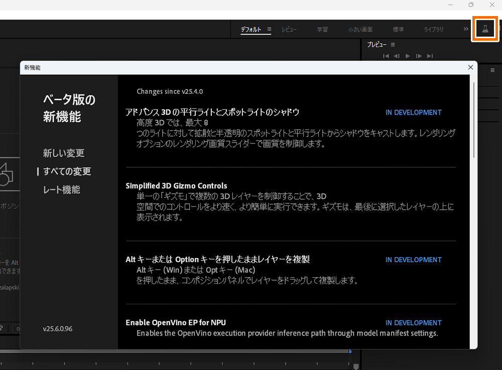 ベータ版のアフターエフェクトで使える新機能を追加・確認する方法です。
